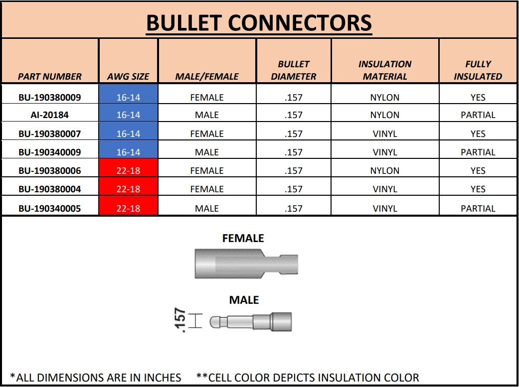 - Insulated Bullet Connectors: Feature a protective coating to prevent short circuits, ideal for high-vibration environments.